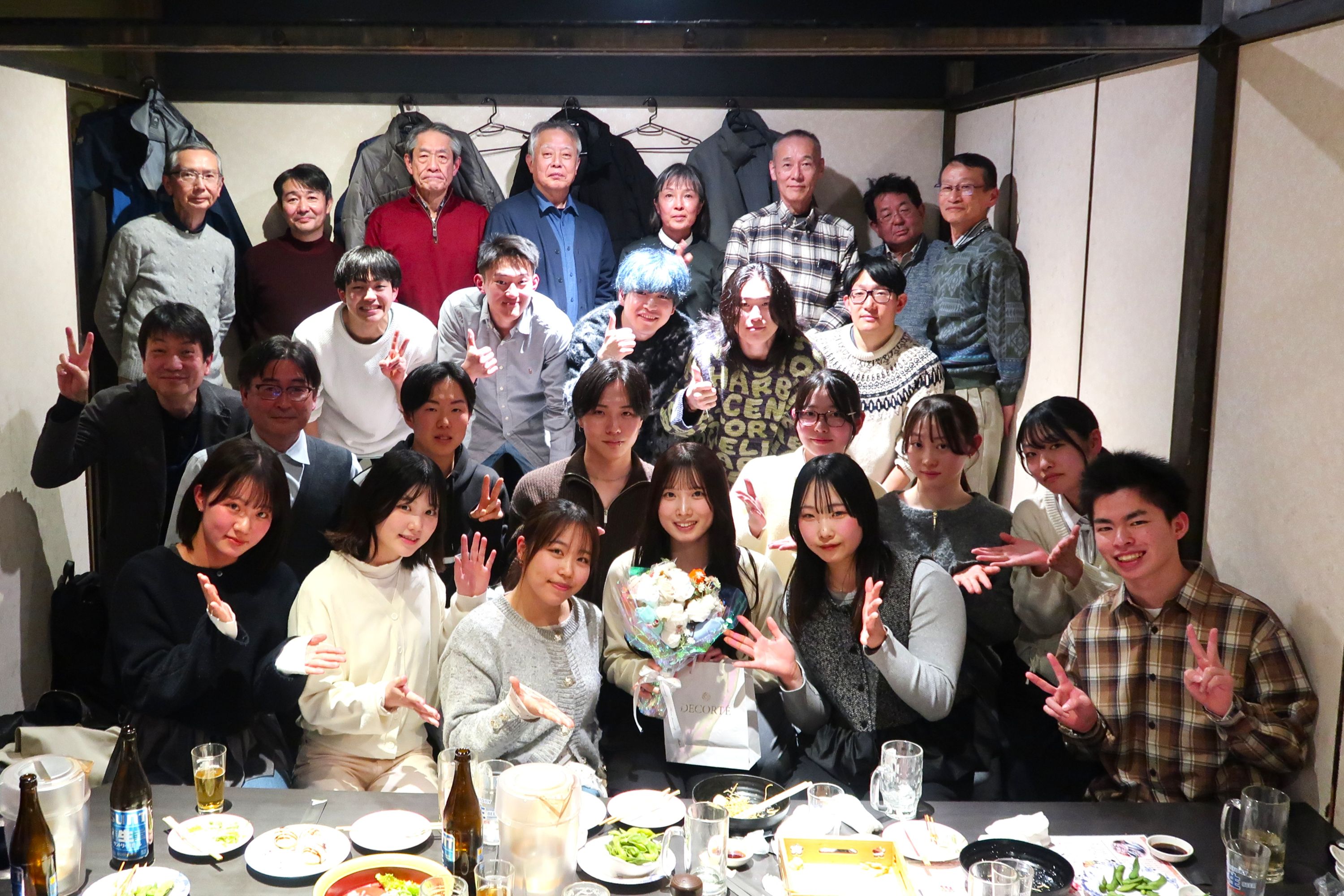 今回は体操部部長の本郷教授にもご参加いただき、10名のOB・OGの皆様と卒業生1名、現役生14名と合わせて総勢26名で大変賑やかな追いコンとなりました。